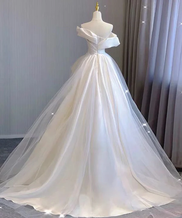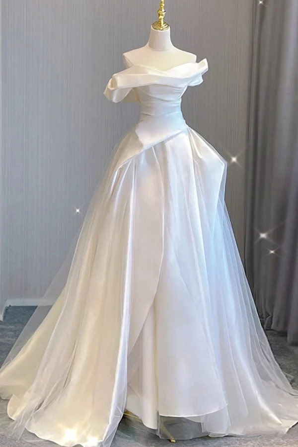 Weißes schulterfreies A-Linien-Brautkleid aus Tüll und Satin, Geburtstagskleid MD7598