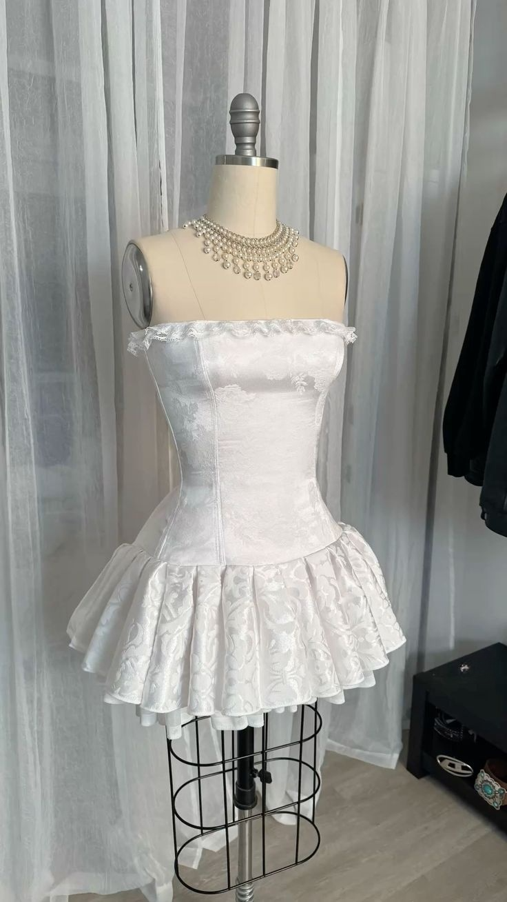 Weißes trägerloses A-Linien-Plissee-Kurzpartykleid, Mini-Geburtstagspartykleid, D1079
