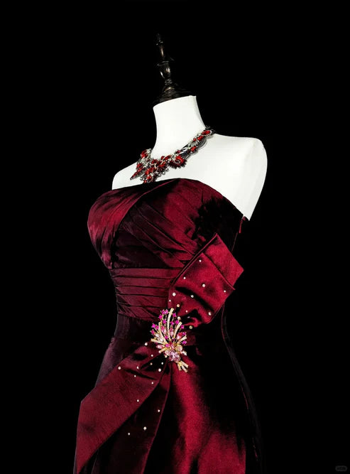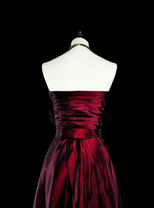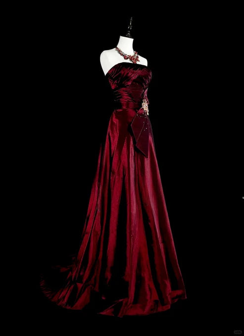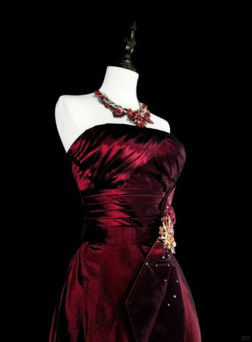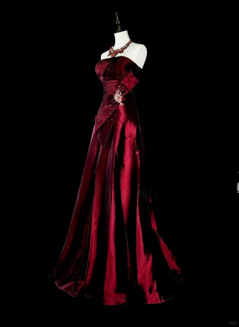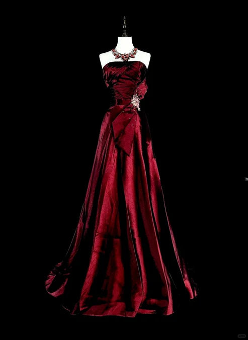 Weinrotes trägerloses A-Linie Satin langes Ballkleid Vintage Abendkleider, D894