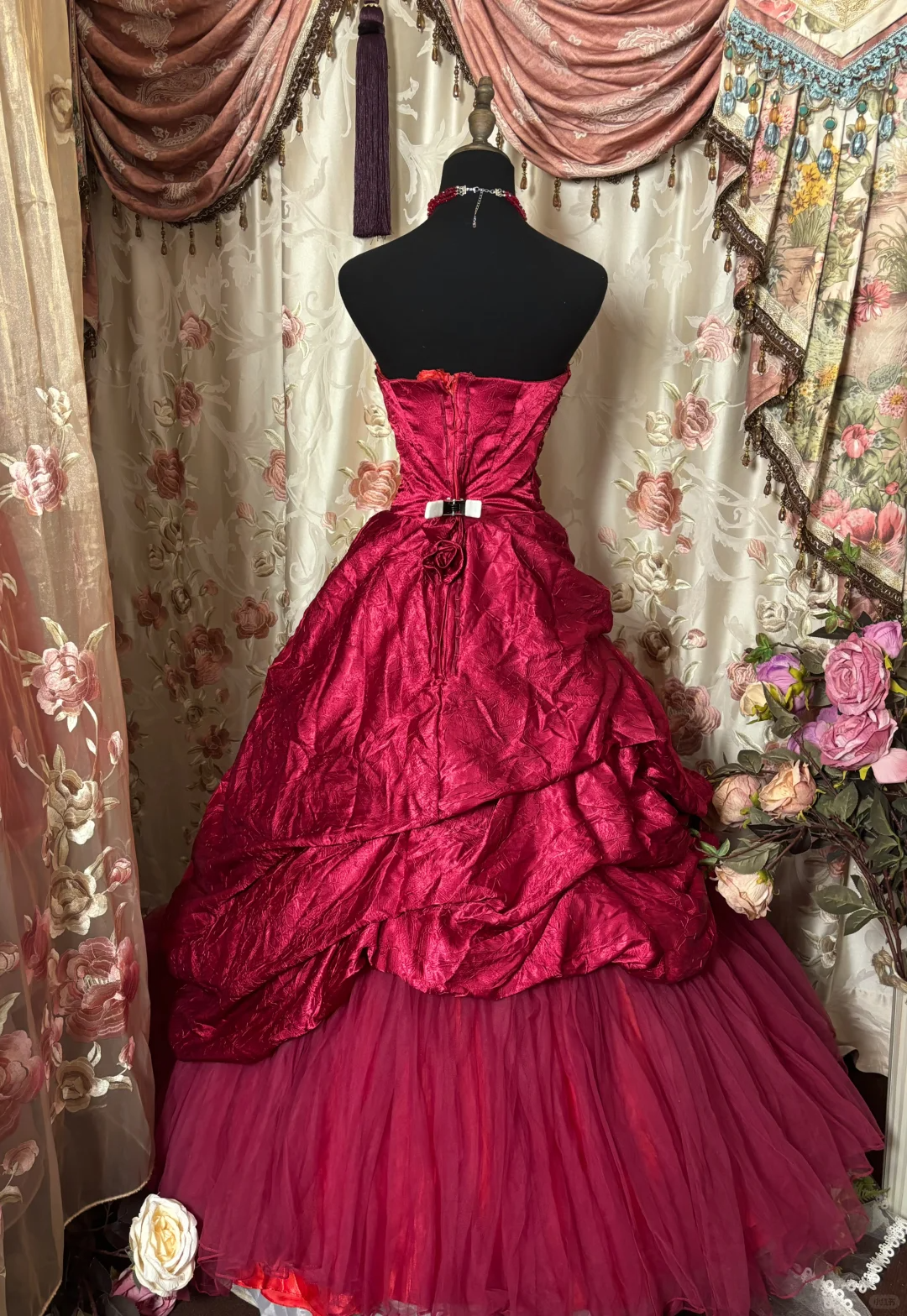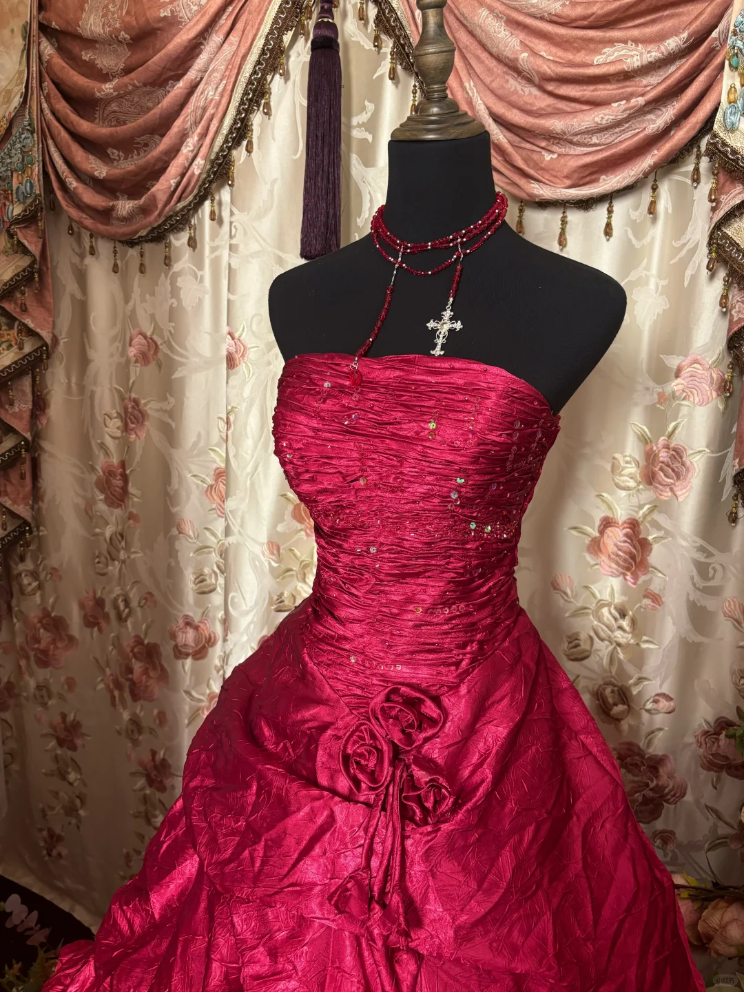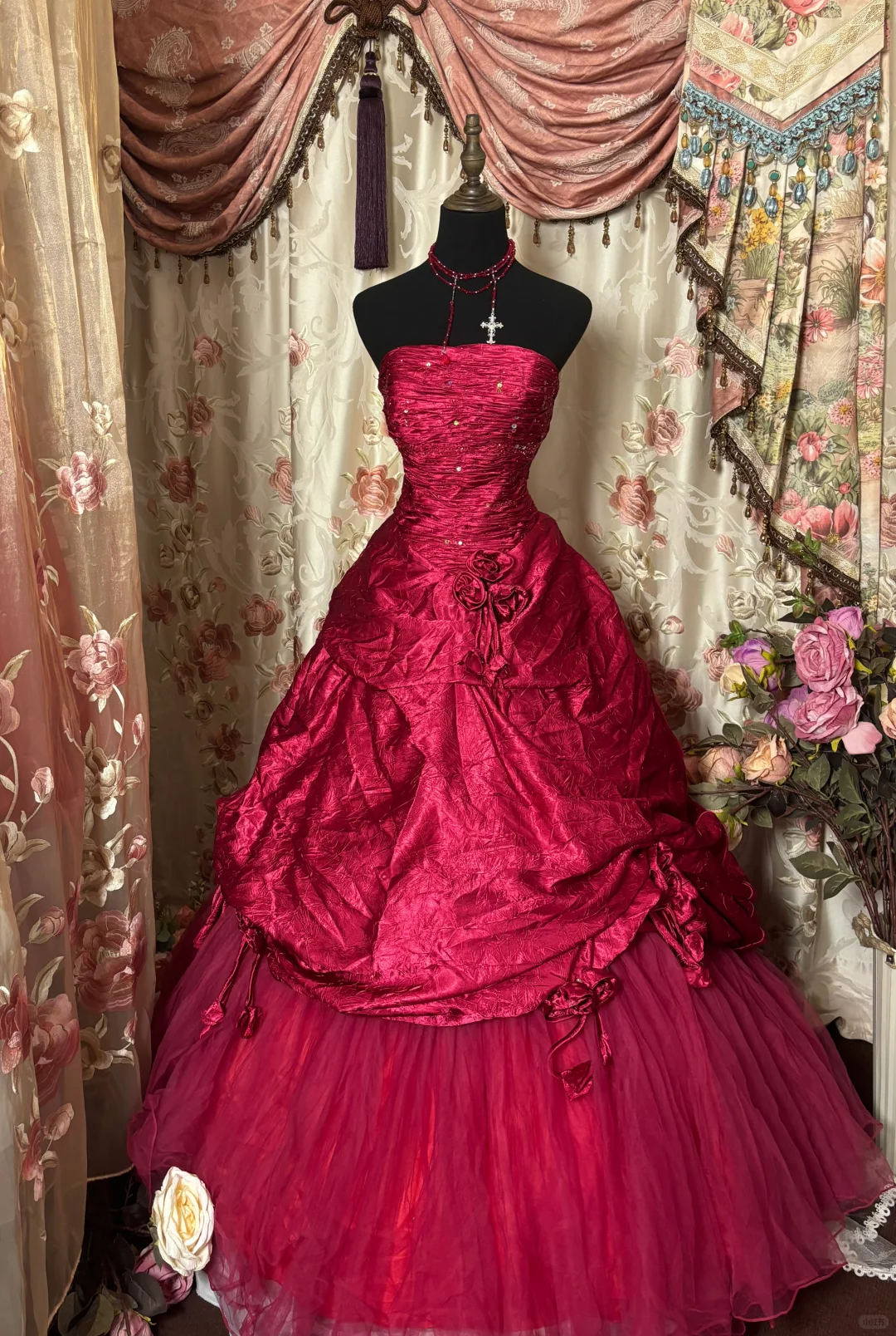 Weinrotes trägerloses A-Linien-Satin-Vintage-Abendkleid, langes Partykleid, D614