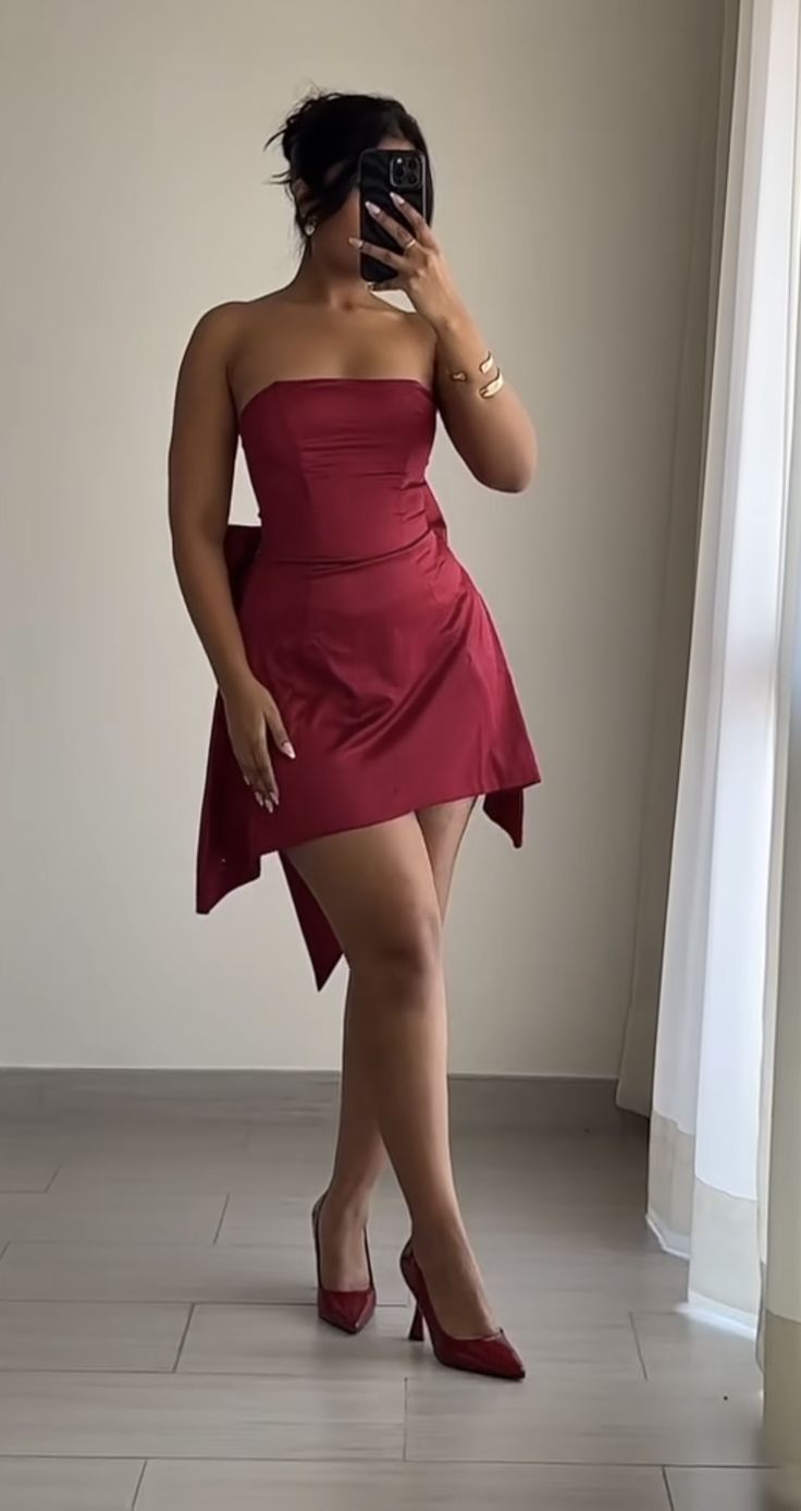 Weinrotes trägerloses, kurzes Partykleid aus Satin, D123