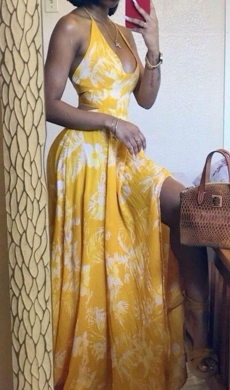 Gelbes Neckholder-A-Linien-Split-Mode-Urlaubskleid Langes Partykleid, D102