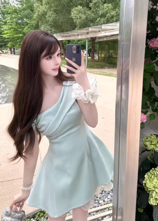 Robe d'été en tulle plissé à volants et col asymétrique pour femme, coupe trapèze, D1927