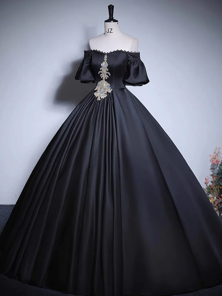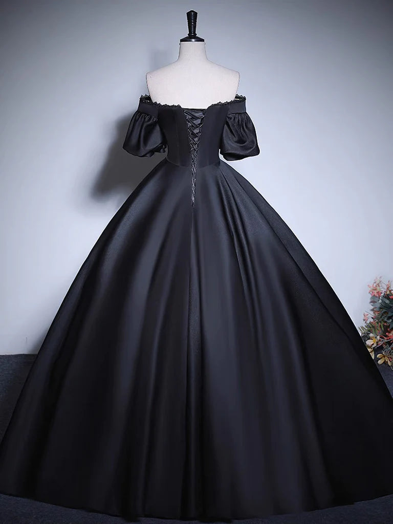 Robe de bal longue en satin noir coupe trapèze, robe de soirée longue en satin noir MD7172