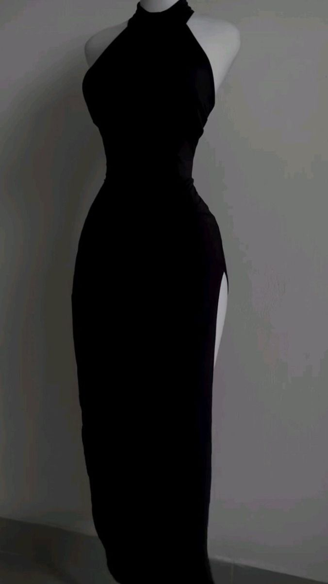 Robe de soirée longue noire élégante à col licou et fente MD7385