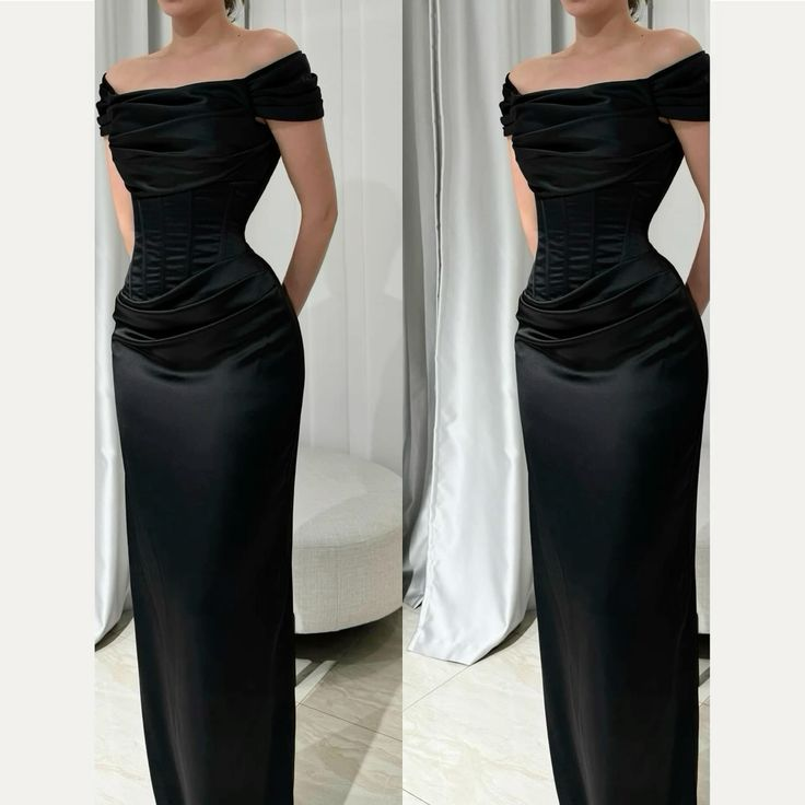 Robe de soirée longue noire en satin à épaules dénudées et style sirène MD7822
