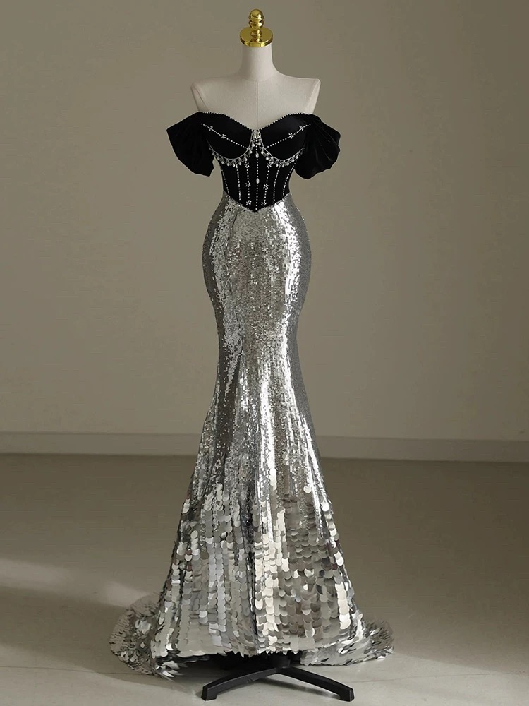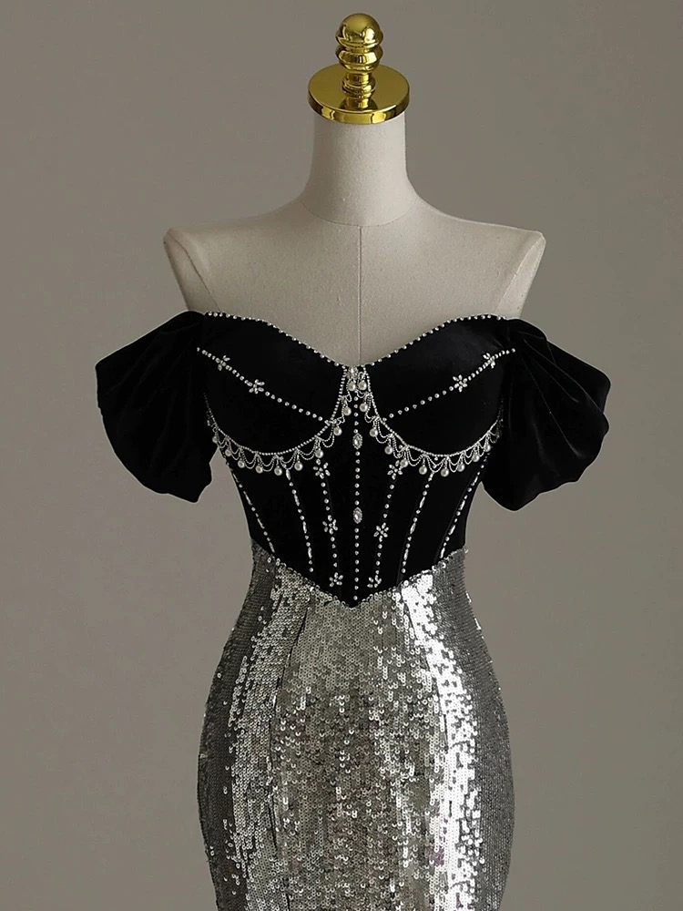 Robe de bal longue noire à paillettes et épaules dénudées, style sirène, robe d'anniversaire MD7424