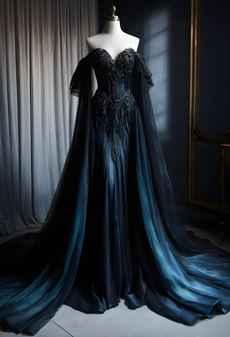 Robe de soirée longue bleu foncé à épaules dénudées et décolleté en cœur, coupe trapèze, avec appliques, D817