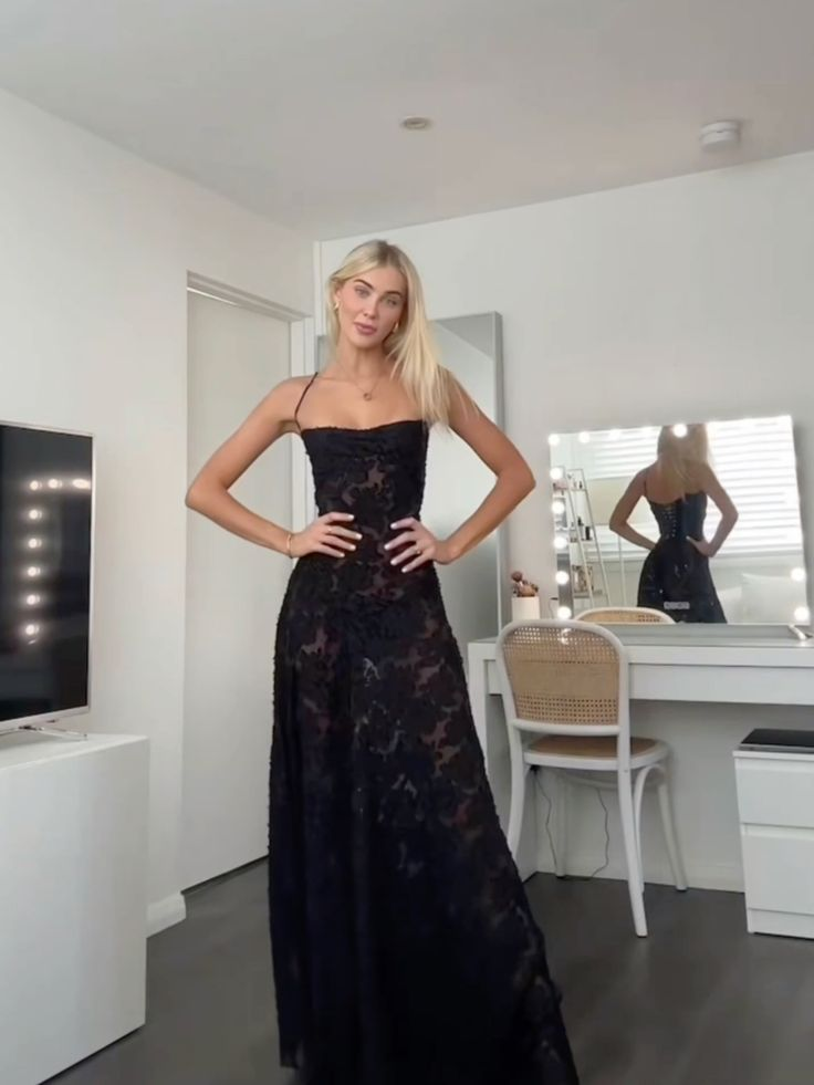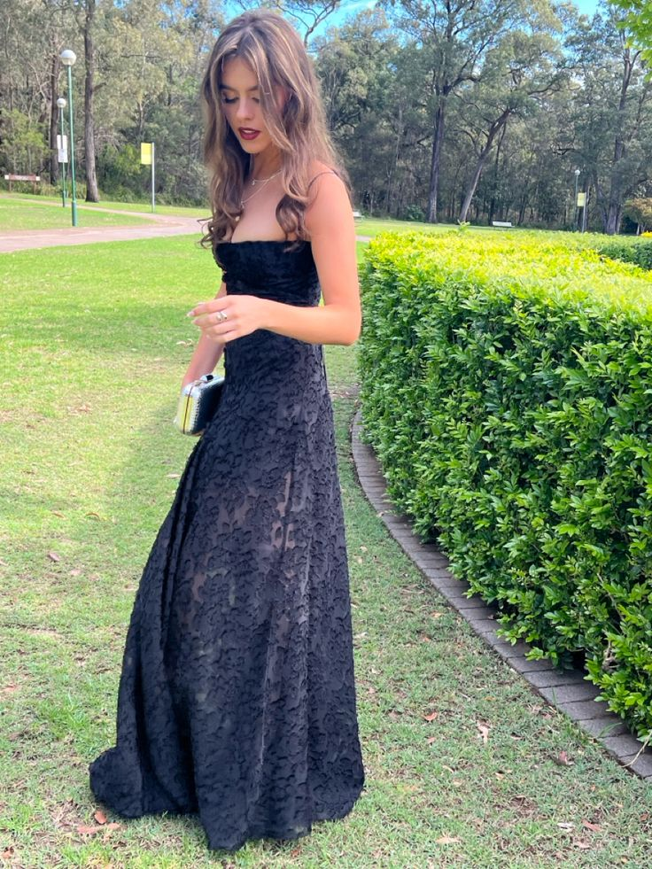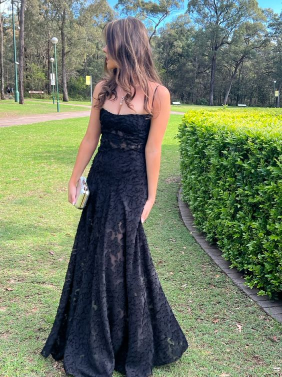 Robe de soirée longue noire à bretelles spaghetti, coupe trapèze, MD7846