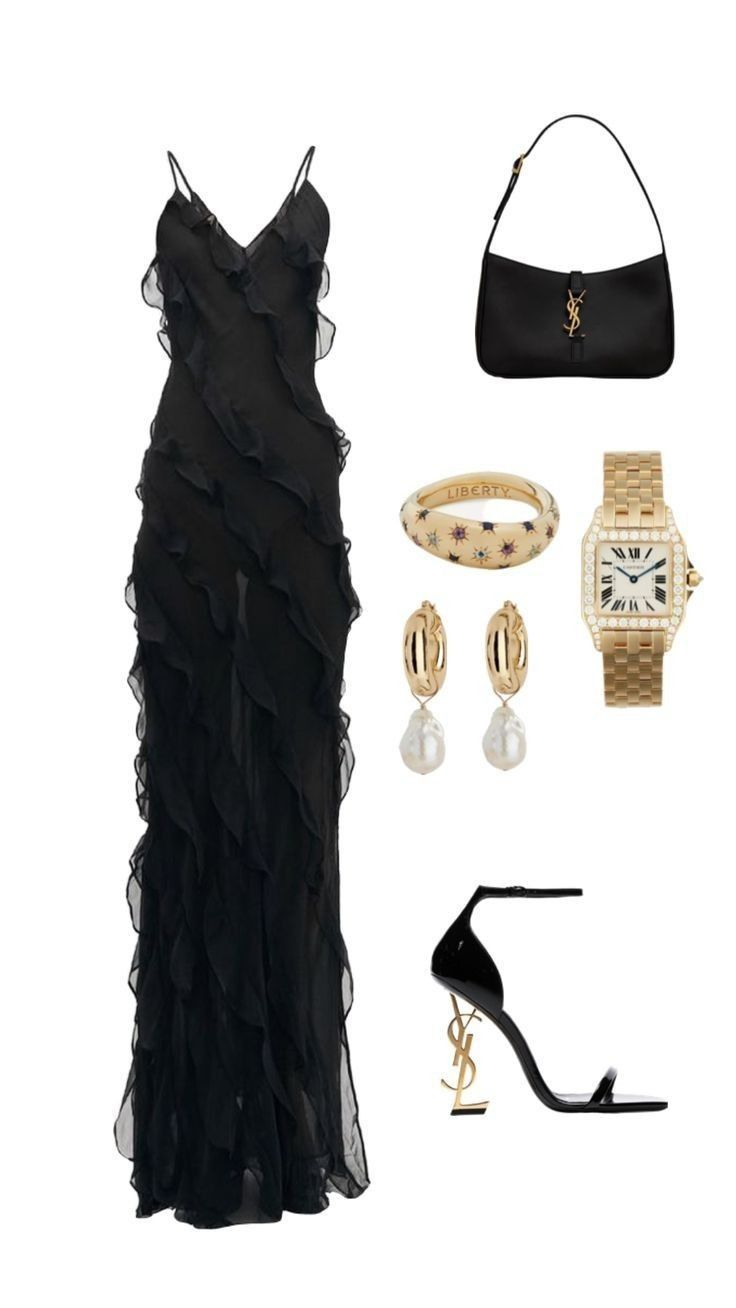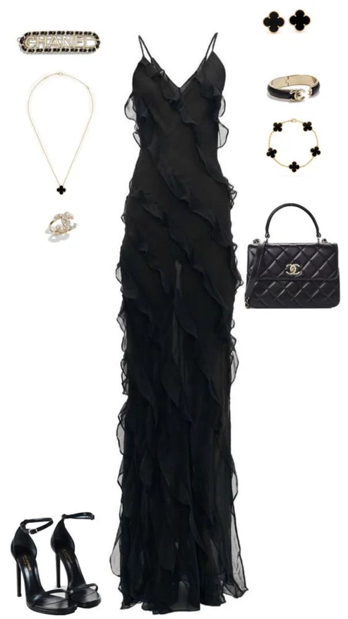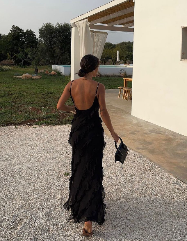 Robe de soirée longue noire à bretelles spaghetti et volants MD7848