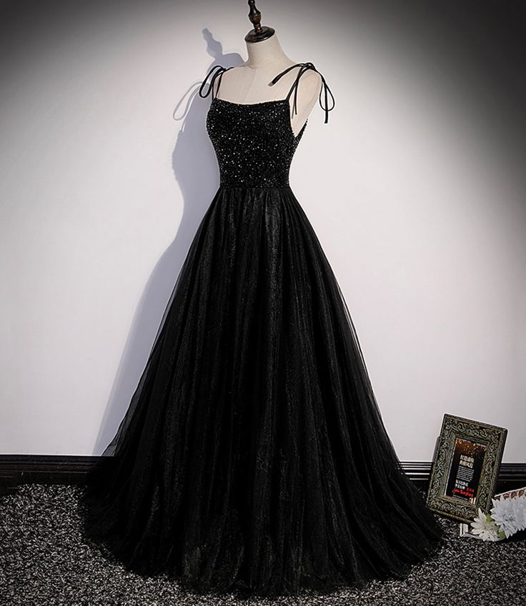 Robe de soirée longue noire en tulle et sequins, coupe trapèze, bretelles, robe de bal MD7693