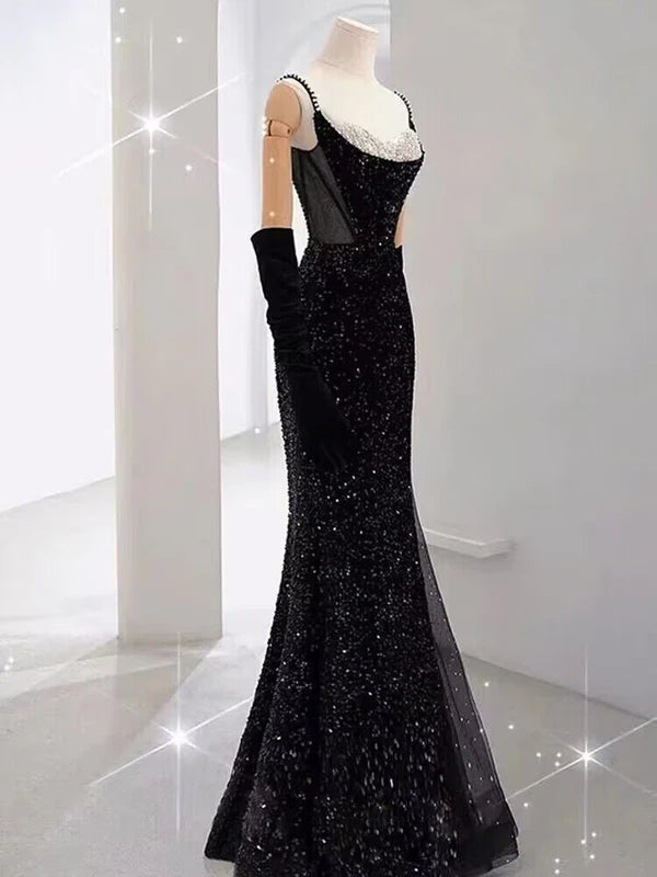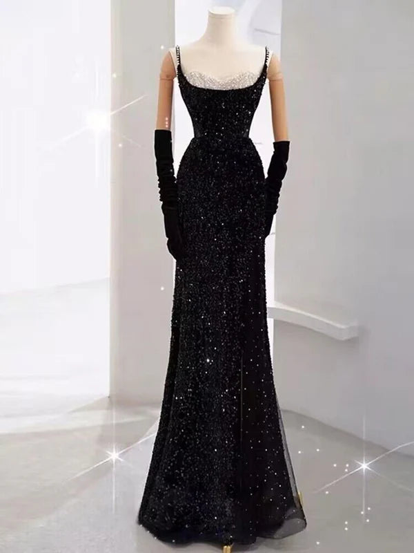 Robe de soirée longue sirène à bretelles noires et sequins MD7655