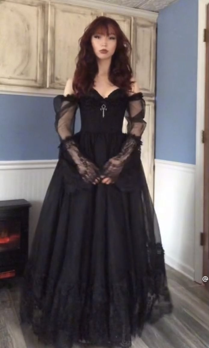 Robe de soirée longue noire en tulle, coupe trapèze, décolleté en cœur, style gothique, MD7671