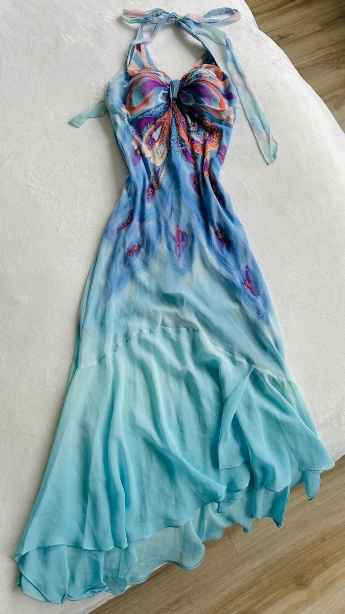Robe de soirée longue fourreau en mousseline de soie bleue à col licou, robe de soirée vintage, D974