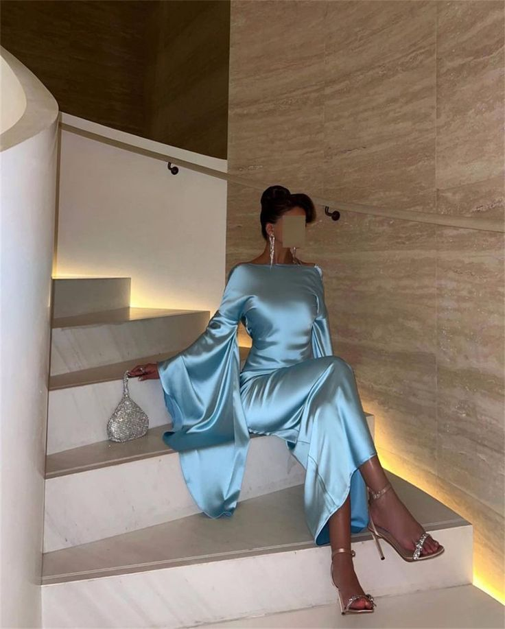Robe de soirée longue sirène en satin bleu à manches longues et dos croisé MD7425