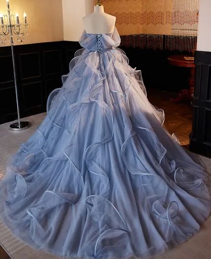 Robe de soirée longue bleue à volants, épaules dénudées, coupe trapèze, MD7755