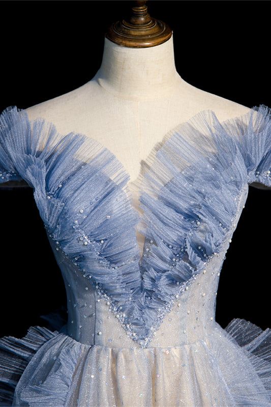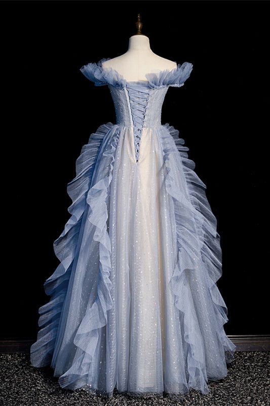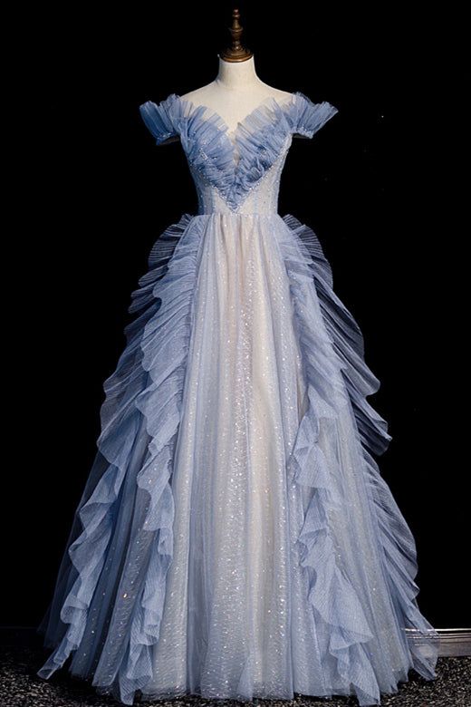 Robe de soirée longue en tulle bleu à épaules dénudées et coupe trapèze MD7793