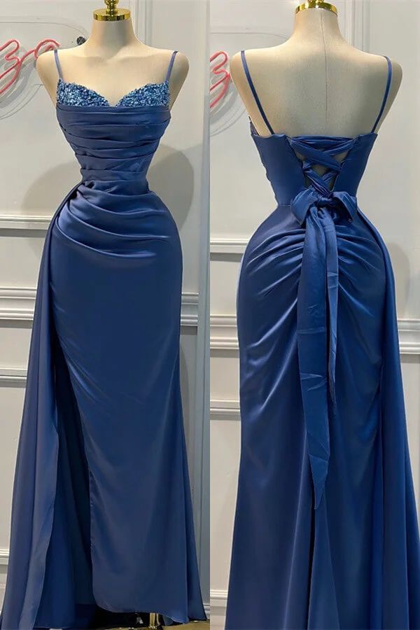 Robe de bal longue en satin bleu à bretelles spaghetti, D27