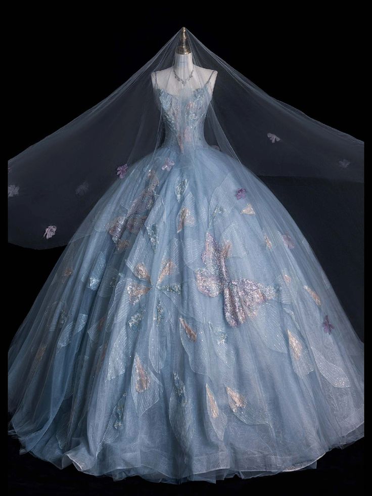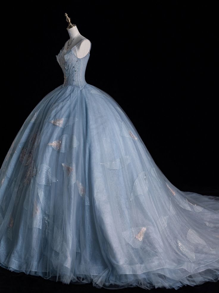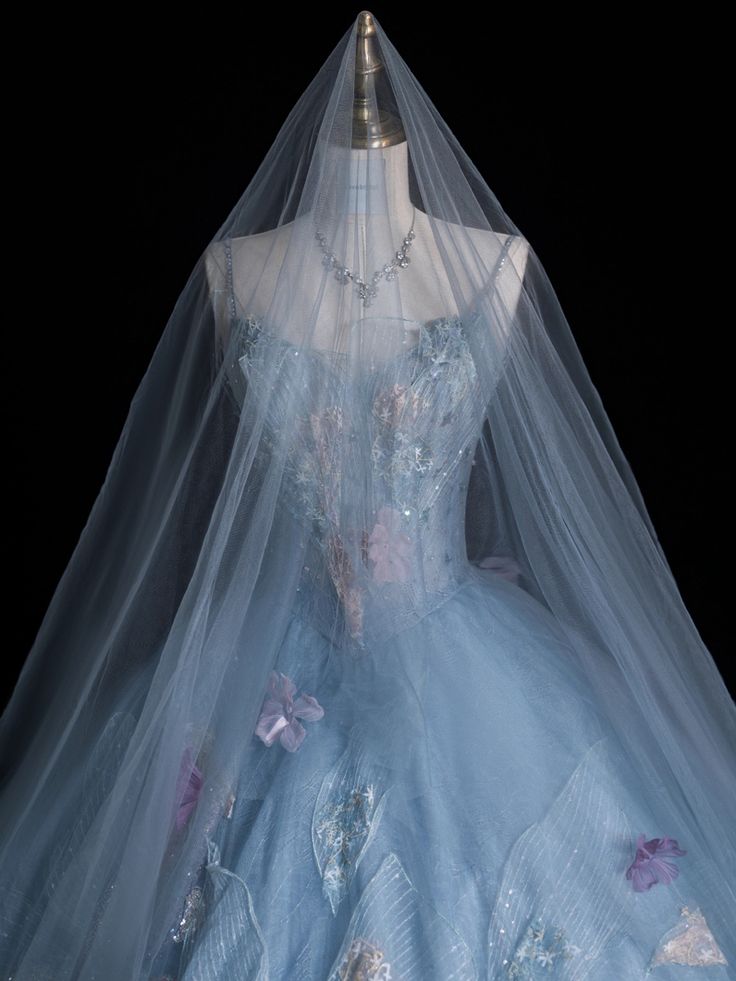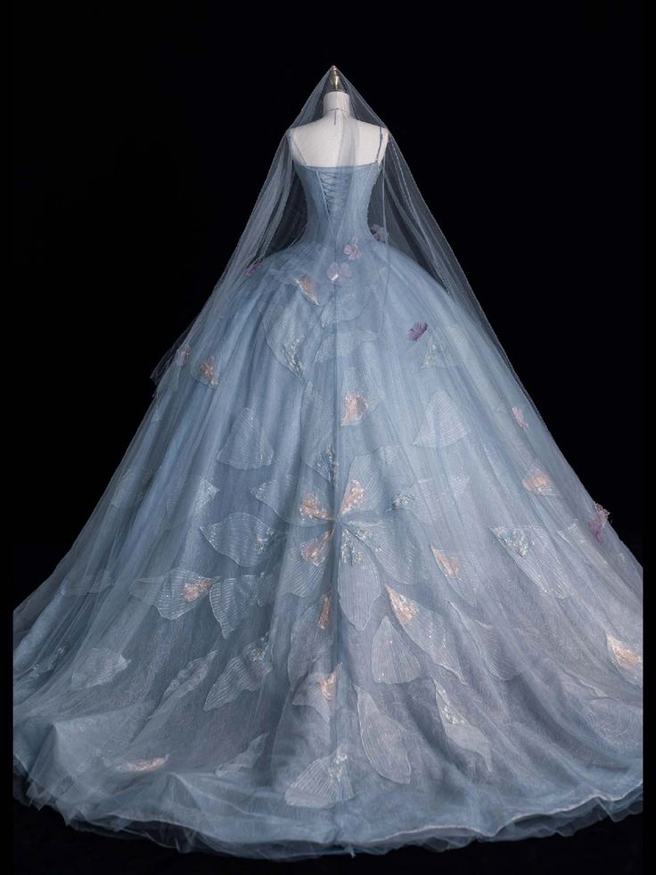 Robe de bal longue en tulle à bretelles bleues, coupe trapèze, avec appliques florales, MD7933