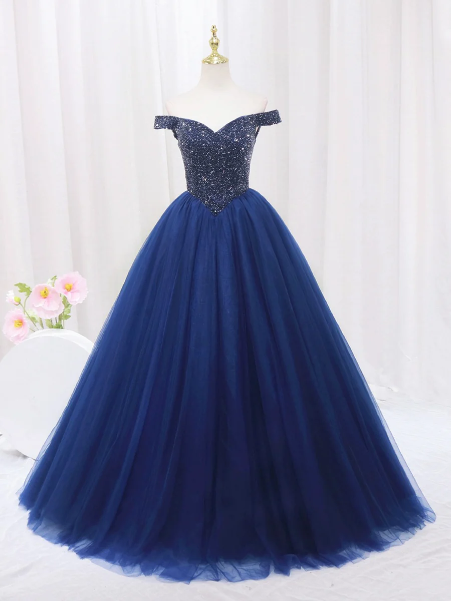 Robe de bal longue en tulle bleu perlé, robe de soirée à épaules dénudées MD7198