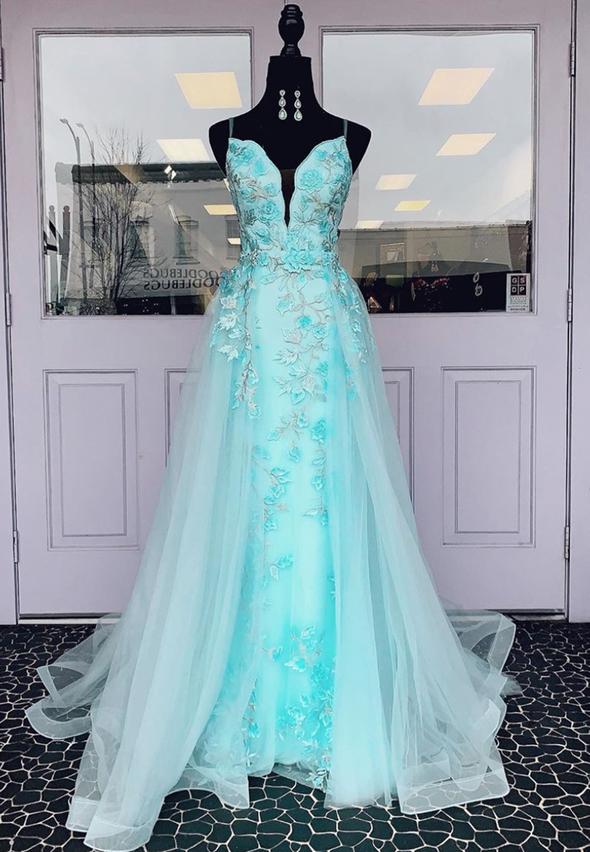 Robe de soirée longue en tulle et dentelle bleue M861