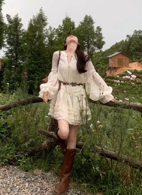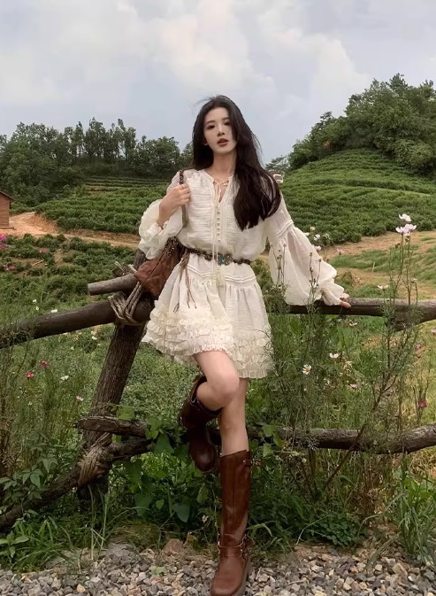 Robe courte style bohème à volants, col en V, à lacets, plissée, à volants, pour les vacances, été, pour femme, D1998