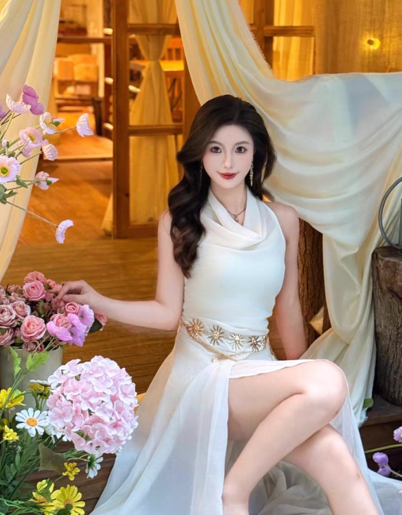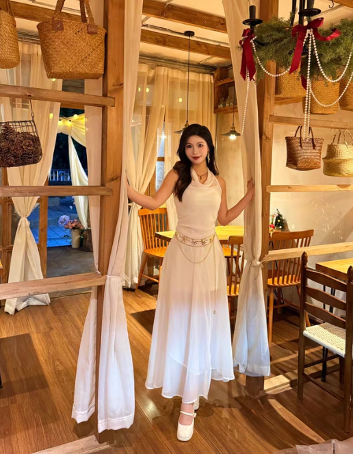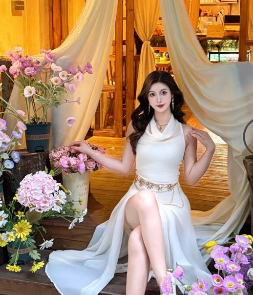 Robe longue bohème en tulle à col licou pour vacances d'été en bord de mer pour femme D1981