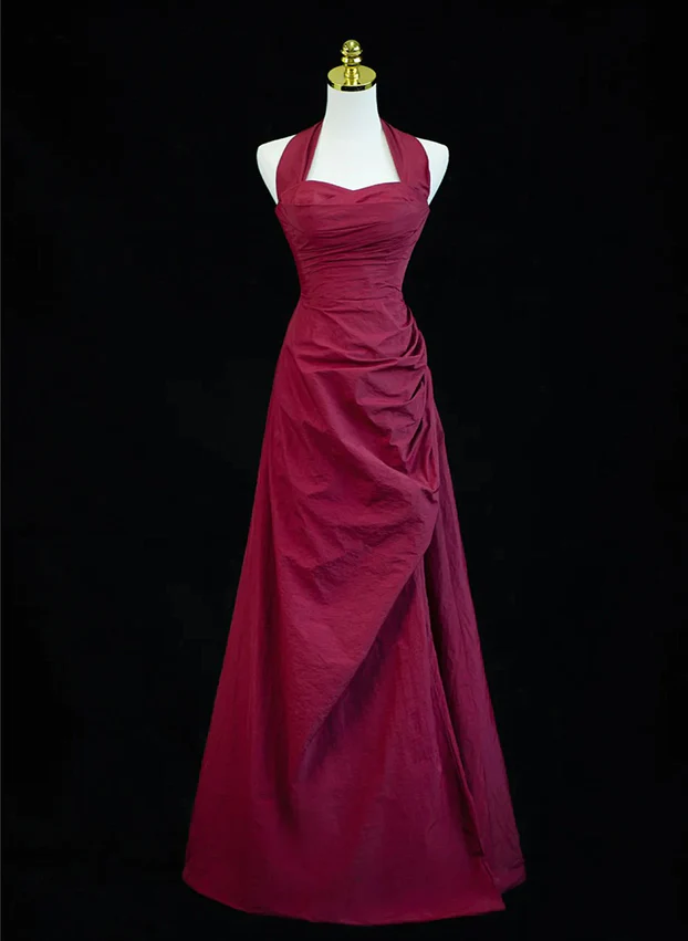 Robe de bal longue bordeaux à col licou et coupe trapèze, style vintage, MD7341