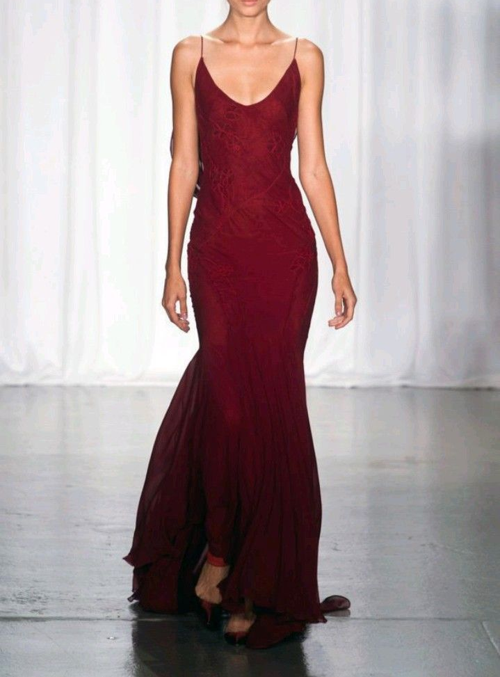 Robe de soirée longue bordeaux à bretelles spaghetti et dos nu style sirène MD7709