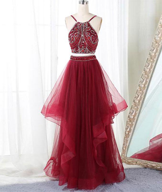 Robe de bal longue bordeaux deux pièces ornée de perles, robe de soirée bordeaux M4850
