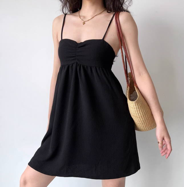 Robe noire décontractée trapèze à bretelles spaghetti et jupe courte pour femme et adolescente D2268