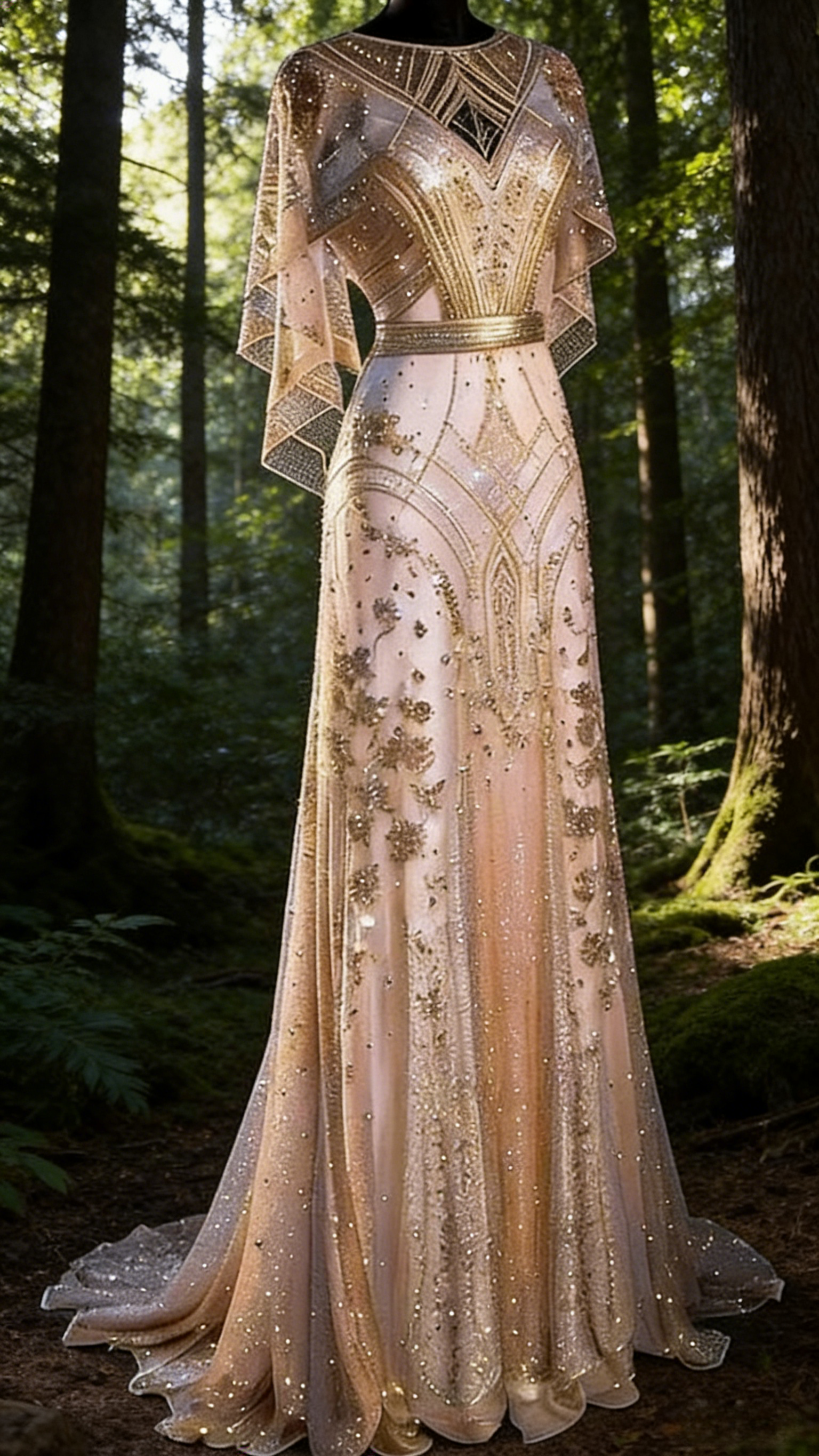 Robe de soirée élégante longue de bal de fin d'année, coupe trapèze, couleur champagne doré, ornée de perles, D829