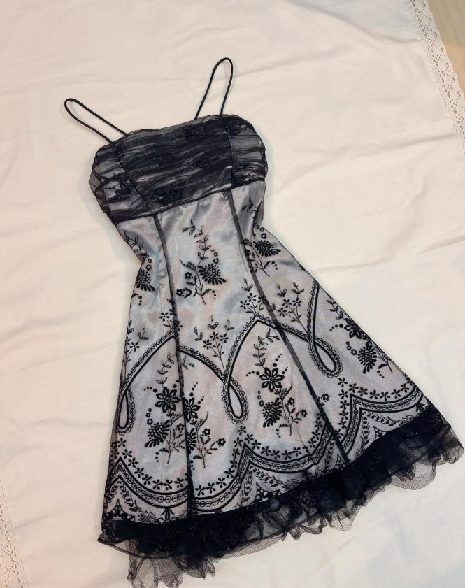 Robe de soirée courte en mousseline de soie à bretelles fines et motif floral chic, D1327