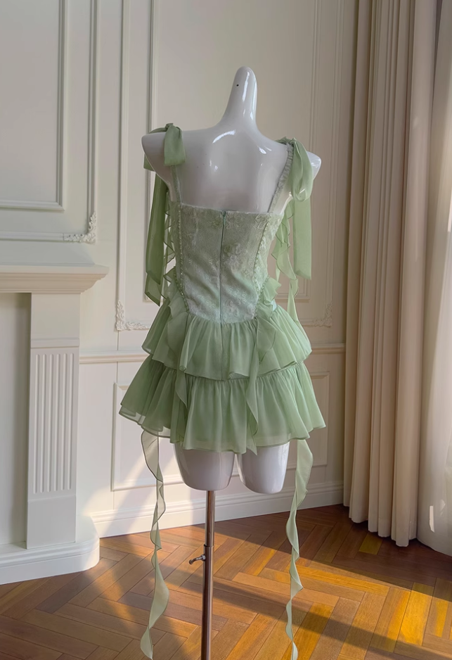Robe de soirée trapèze à bretelles spaghetti, style chic vert avec ourlet à volants et appliques, robe de bal, D1345
