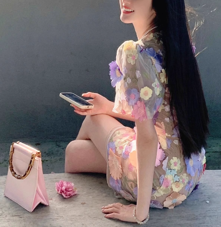 Robe de soirée trapèze à manches courtes et motif appliqué coloré D1447