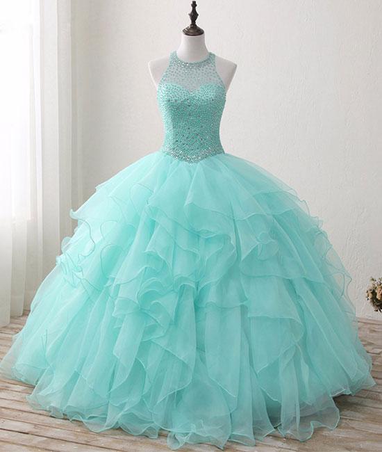 Robe de bal longue en tulle vert à col rond et perles, robe Sweet 16 M4885