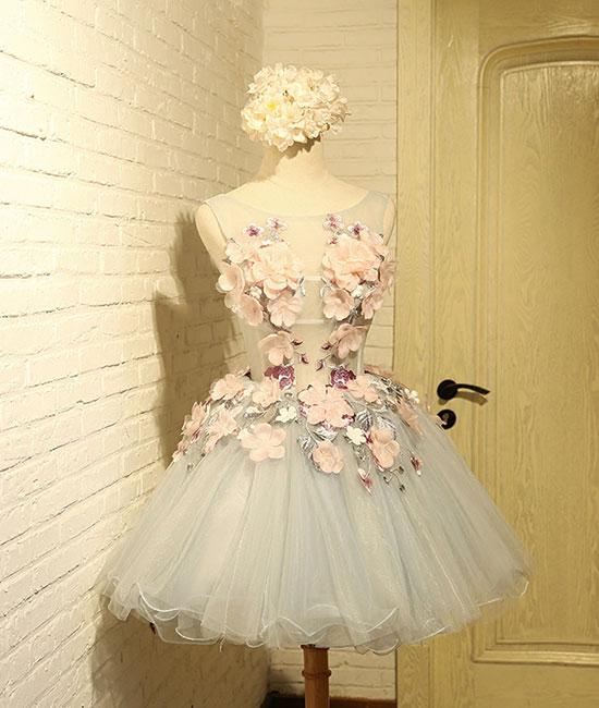 Robe de bal courte en tulle gris à col rond et appliques en dentelle M4872