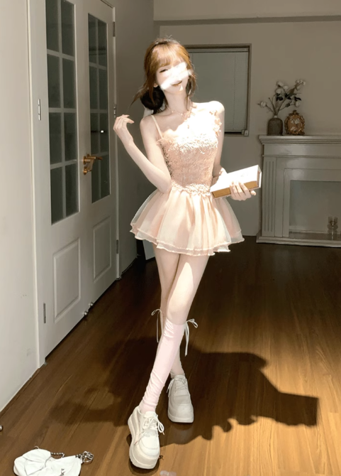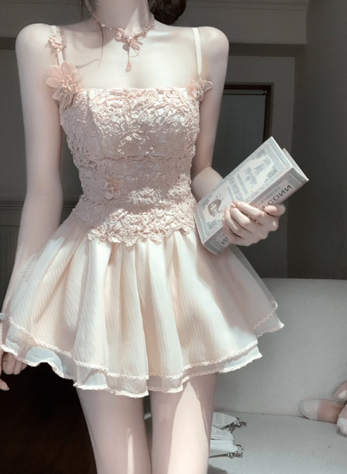 Robe de soirée courte plissée à volants et bretelles spaghetti, brodée de fleurs, pour femme, tenue d'été D1964