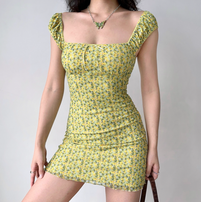 Robe d'été mignonne à col carré, jupe courte ajustée imprimée, pour femme, adolescente, vacances, rendez-vous, soirée, D2283