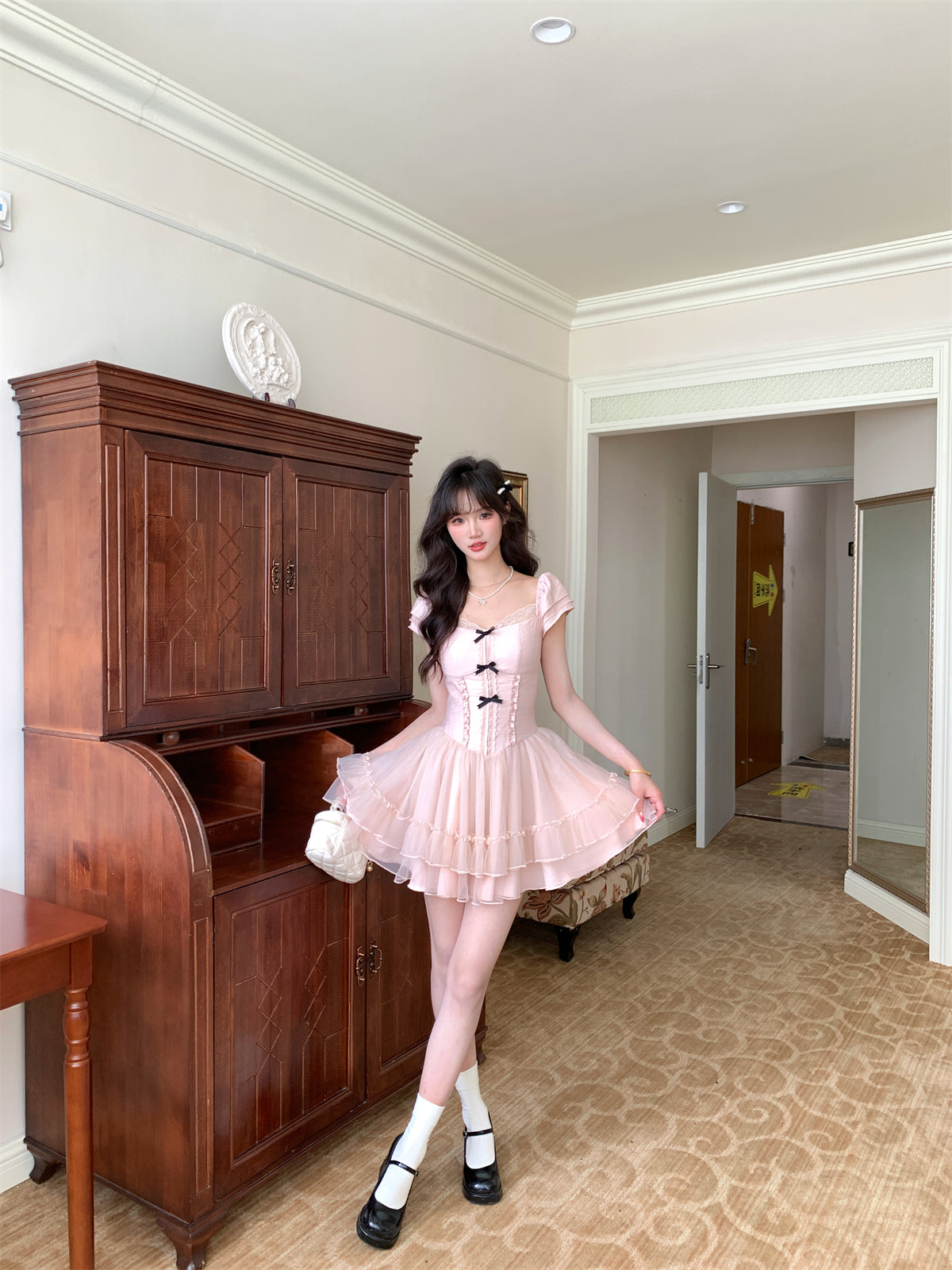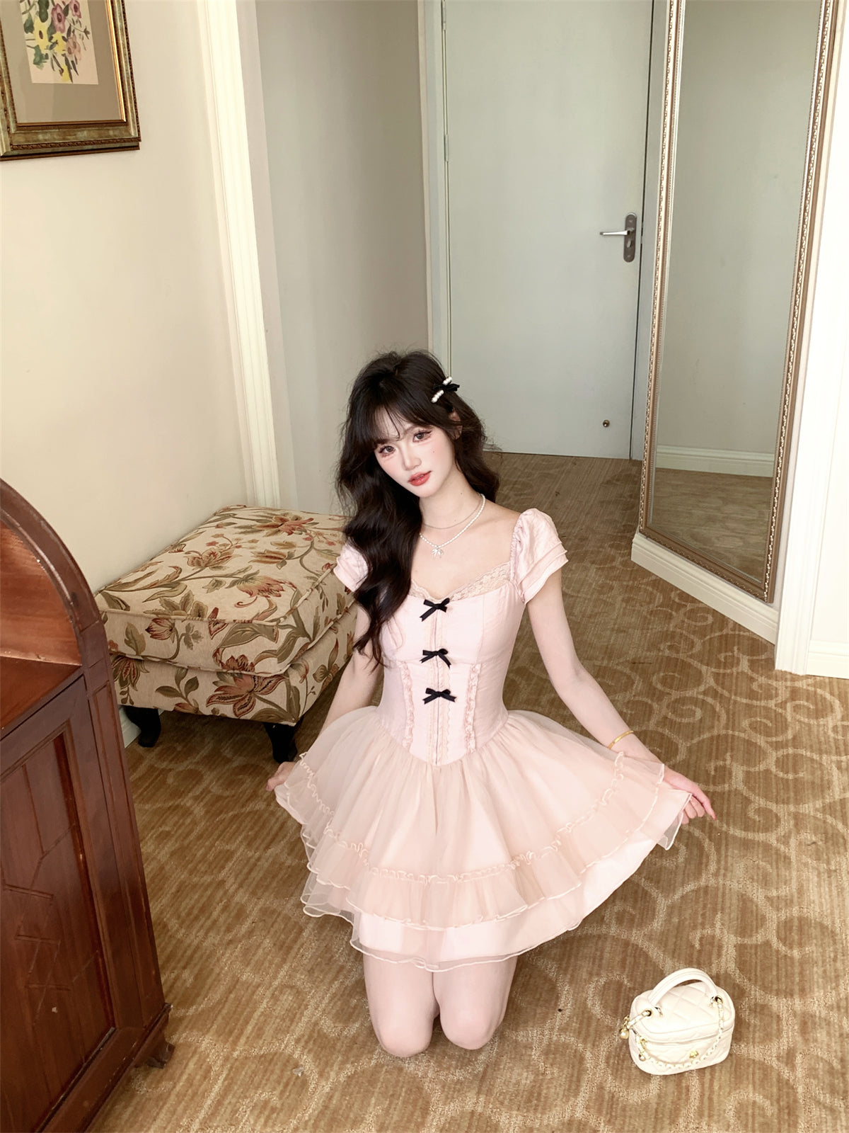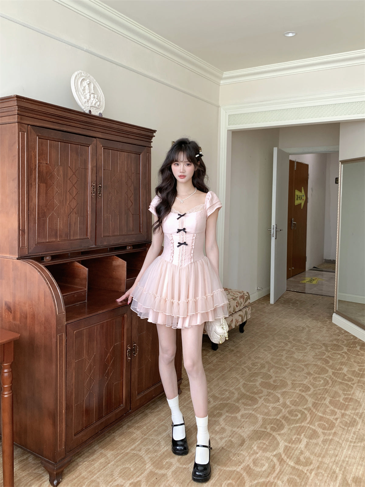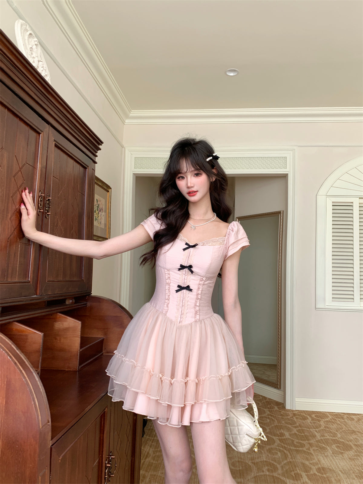 Robe de bal courte drapée à volants et décolleté carré en dentelle avec nœud papillon D1754