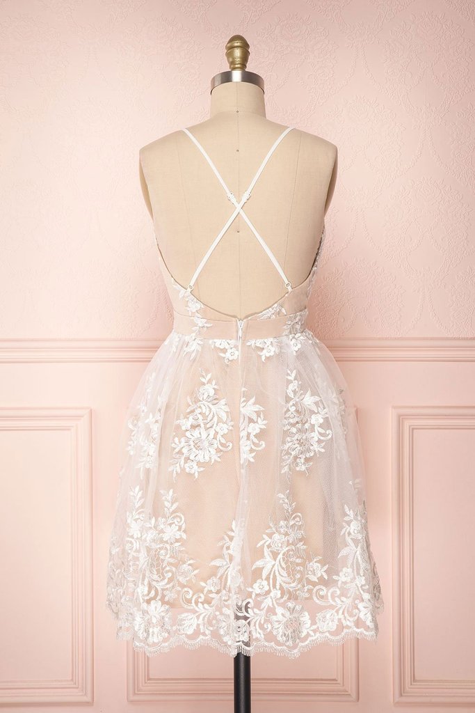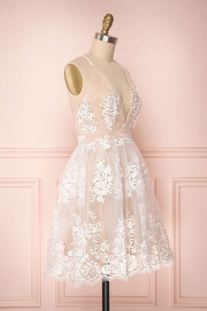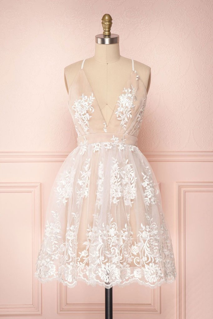Robe de bal courte en dentelle rose, décolleté en V, dos nu, avec appliques, robe de soirée formelle en dentelle rose M2827