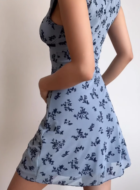 Robe d'été courte en tulle avec imprimé à col en V et jupe ajustée pour femme D2054