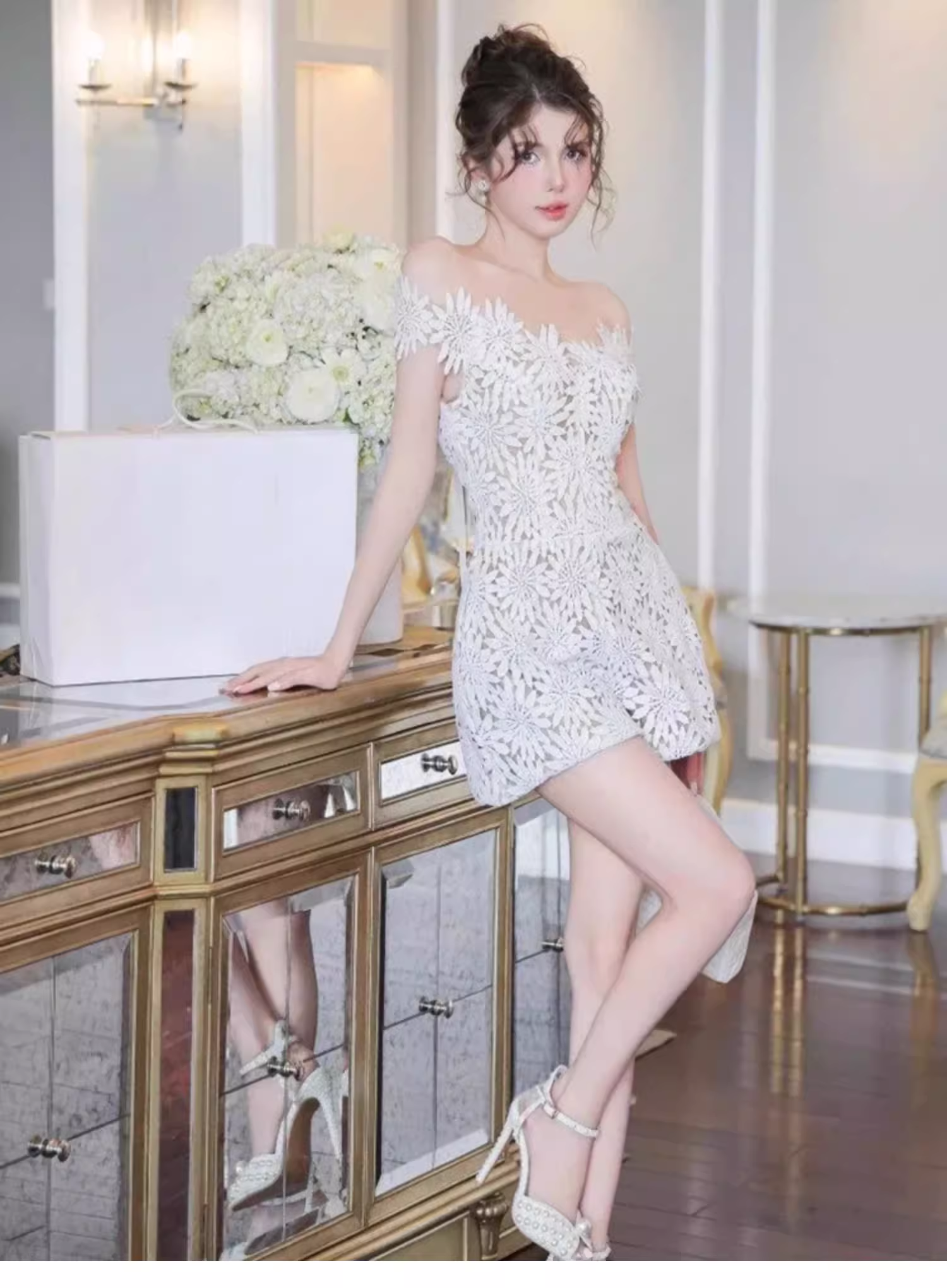 Robe de soirée trapèze blanche à épaules dénudées et appliqués, D1379