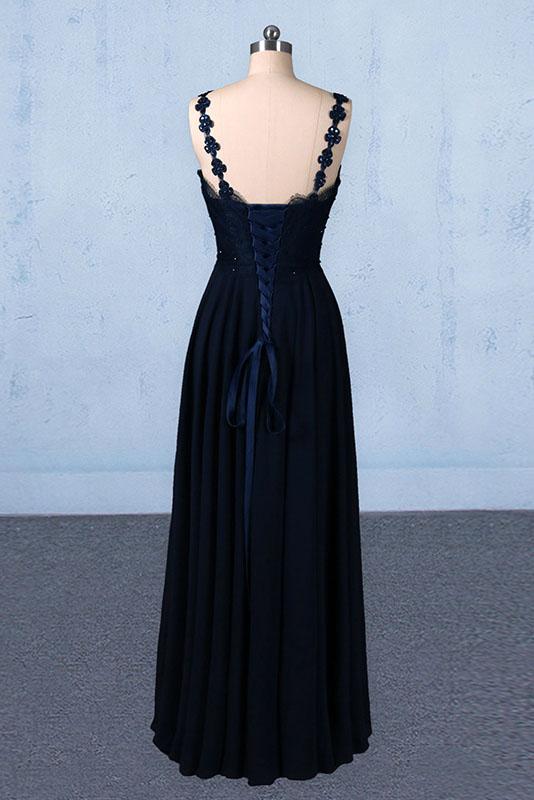 Robe de soirée longue bleu marine foncé à bretelles, en mousseline et dentelle M1832