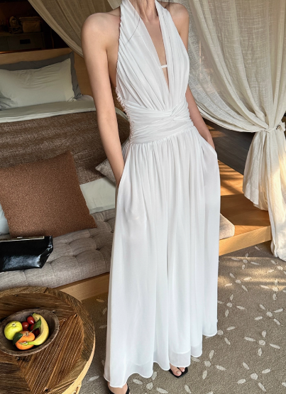 Robe élégante en mousseline de soie, coupe trapèze, col en V, plis, coupe ajustée, jupe longue d'été, tenue de rendez-vous, D1858