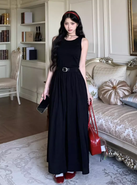 Robe longue élégante à col ras du cou et coupe trapèze pour femme, tenue d'été de bord de mer avec ceinture, D1915