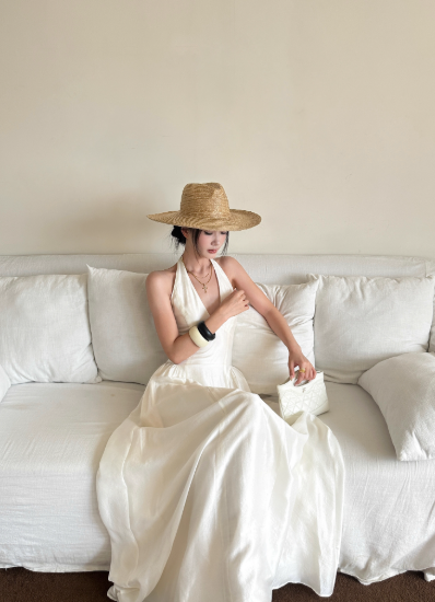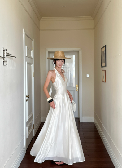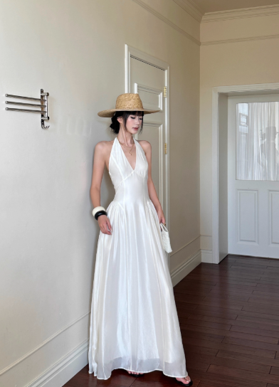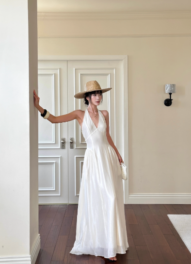 Robe d'été élégante à lacets et col licou avec nœud papillon et jupe longue à volants pour femme D1857