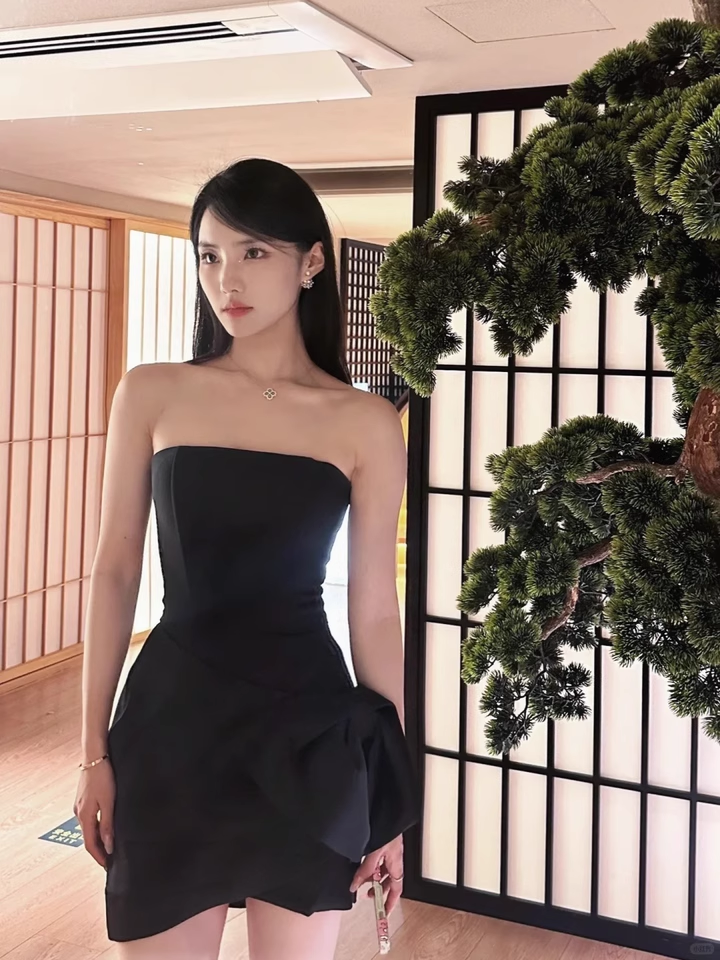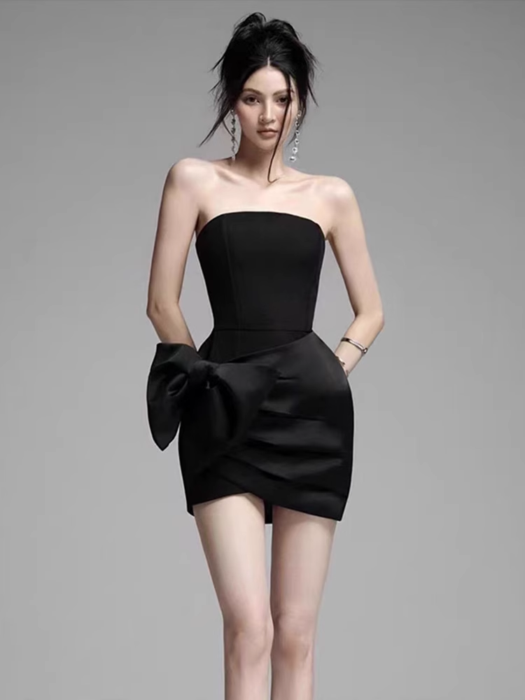 Robe de soirée trapèze en satin noir, élégante, sans bretelles, avec nœud, D1371