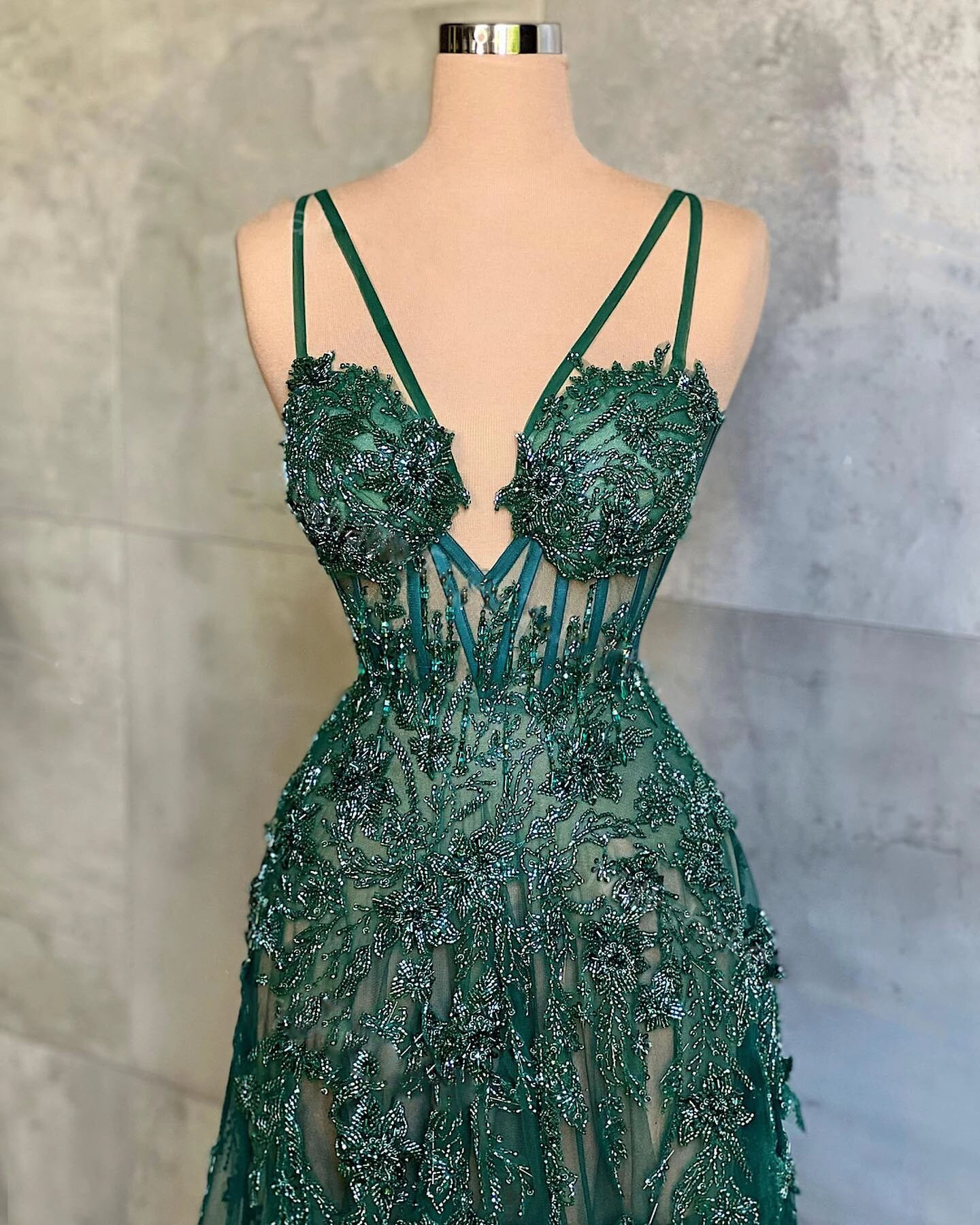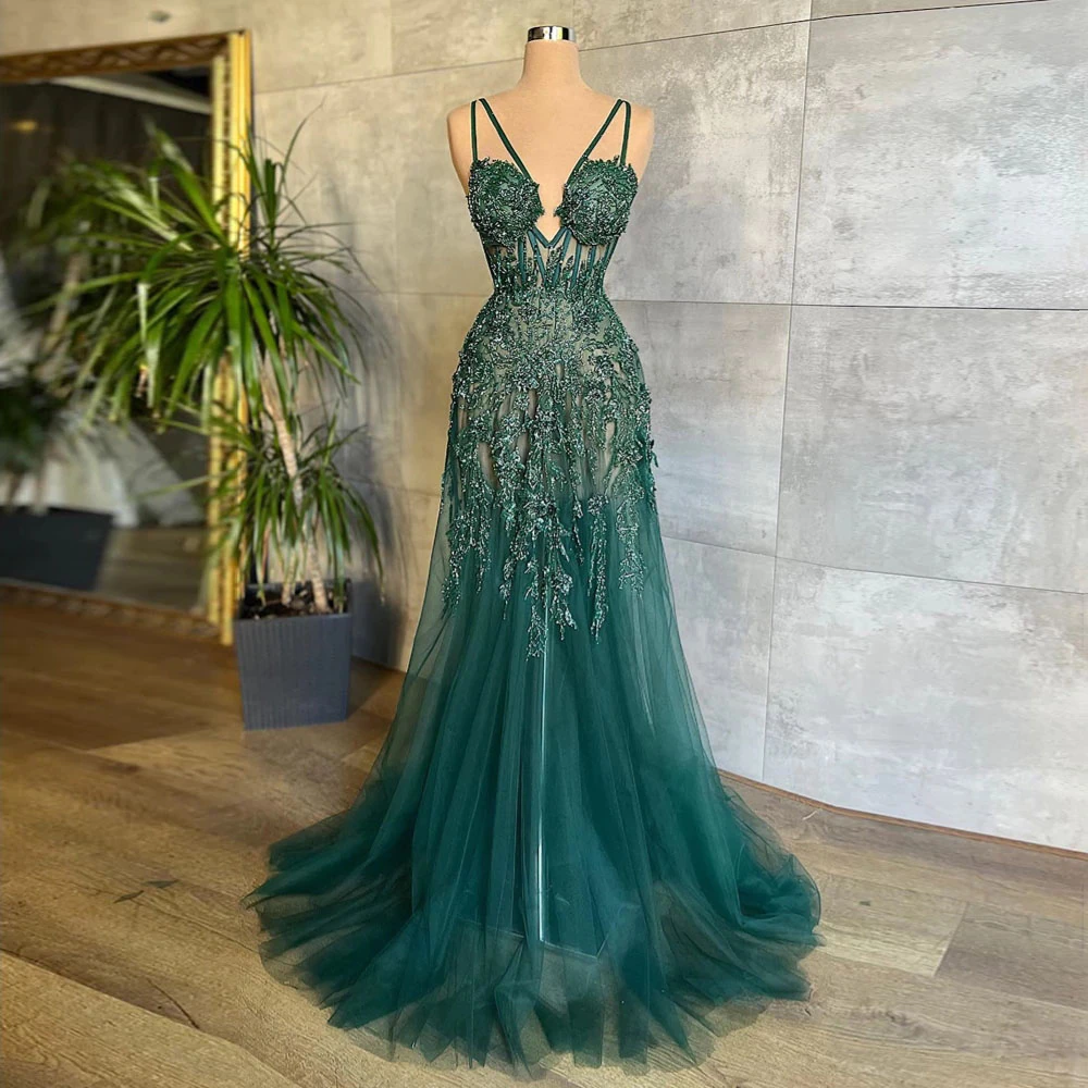 Robe de soirée trapèze verte élégante, nouvelle collection 2022, avec appliques et perles, longue robe de bal à lacets et bretelles spaghetti, robe de cérémonie, MD7072