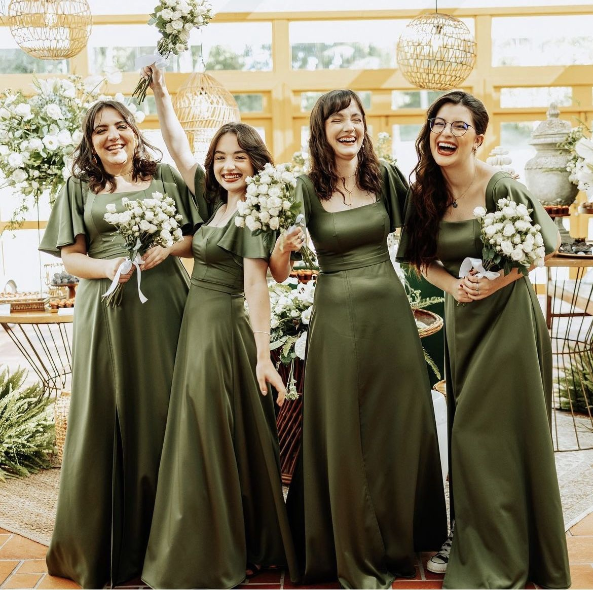 Robe de demoiselle d'honneur longue et élégante en satin vert, coupe trapèze, col carré, simple, D1088